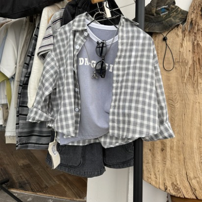 # 여름체크남방+블랙데님반바지set